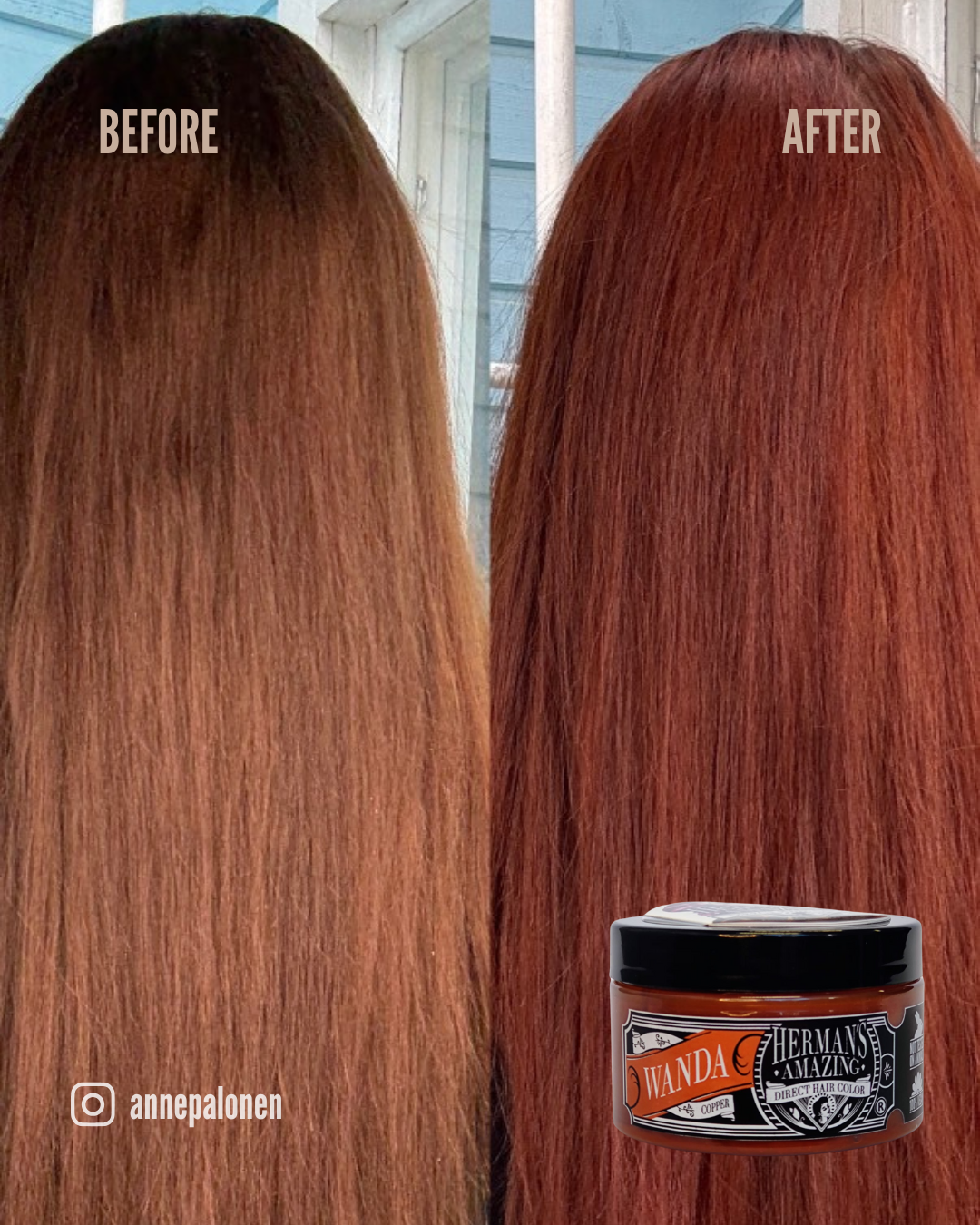 Apply a thick layer of Wanda Copper hair dye on dry towel-dry, unconditioned hair and leave it in for 60-90 minutes. For longer lasting results leave the color for 2+ hours or even overnight. Our hair colors are conditioner-based, so they nourish your hair like a deep conditioner while you color. Rinse with cool or lukewarm water and enjoy your intense copper hair color, that will last from few weeks to several months, depending on the chosen shade, base and condition of the hair, duration of the color and hair care routine.